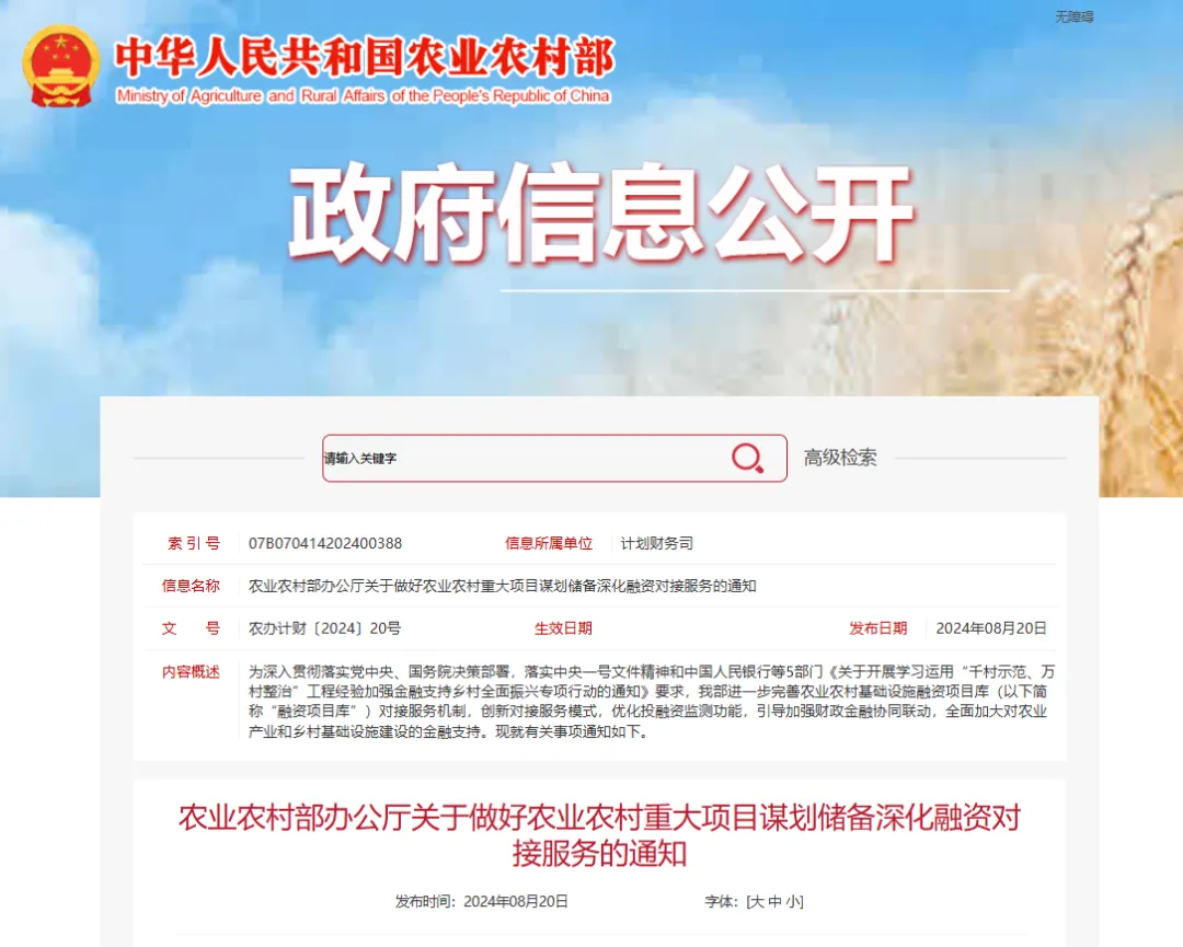 農(nóng)業(yè)農(nóng)村部辦公廳關(guān)于做好農(nóng)業(yè)農(nóng)村重大項目謀劃儲備深化融資對接服務(wù)的通知為深入貫徹落實黨中央、國務(wù)院決策部署,落實中央一號文件精神和中國人民銀行等5部門《關(guān)于開展學(xué)習(xí)運用“千村示范、萬村整治”工程經(jīng)驗加強金融支持鄉(xiāng)村全面振興專項行動的通知》要求,我部進(jìn)一步完善農(nóng)業(yè)農(nóng)村基礎(chǔ)設(shè)施融資項目庫(以下簡稱“融資項目庫”)對接服務(wù)機(jī)制,創(chuàng)新對接服務(wù)模式,優(yōu)化投融資監(jiān)測功能,引導(dǎo)加強財政金融協(xié)同聯(lián)動,全面加大對農(nóng)業(yè)產(chǎn)業(yè)和鄉(xiāng)村基礎(chǔ)設(shè)施建設(shè)的金融支持?,F(xiàn)就有關(guān)事項通知如下。