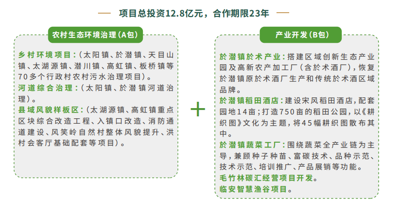 該項(xiàng)目范圍為臨安區(qū)錢塘江流域、苕溪流域面源污染治理和產(chǎn)業(yè)開發(fā),包括144個(gè)行政村農(nóng)村生活污水治理及“污水零直排區(qū)”提質(zhì)增效,及河道水生態(tài)環(huán)境綜合整治項(xiàng)目,包括河道水質(zhì)提升改善、截污納 管、水生態(tài)和水環(huán)境綜合治理、對河道的受污染水體進(jìn)行污染物消減和生態(tài)自凈功能恢復(fù),去除水體中的COD、氨磷等污染物,村落風(fēng)貌景觀樣板區(qū)打造,於潛酒廠,鄉(xiāng)村稻田文旅配套設(shè)施,蔬菜工廠,毛竹林 經(jīng)營碳匯等。