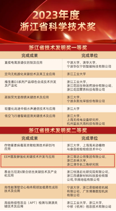 浙江商達(dá)公用集團(tuán)聯(lián)合浙江農(nóng)林大學(xué)、浙江清華長三角研究院合作研發(fā)的“EEM菌發(fā)酵強(qiáng)化關(guān)鍵技術(shù)開發(fā)與應(yīng)用”榮獲浙江省技術(shù)發(fā)明獎(jiǎng)二等獎(jiǎng)。