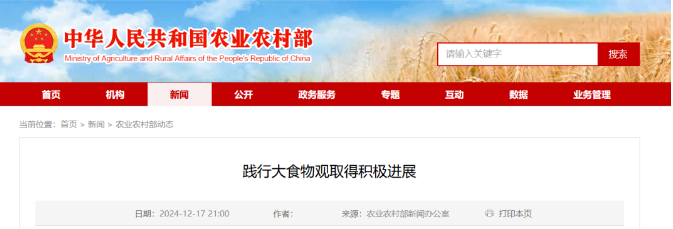 農(nóng)業(yè)農(nóng)村部新聞辦公室于2024年12月17日發(fā)布:《踐行大食物觀取得積極進展》。