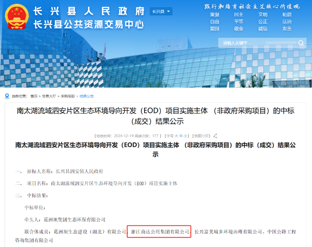 商達(dá)公用集團(tuán)中標(biāo)長興南太湖流域泗安片區(qū)生態(tài)環(huán)境導(dǎo)向開發(fā)(EOD)項(xiàng)目