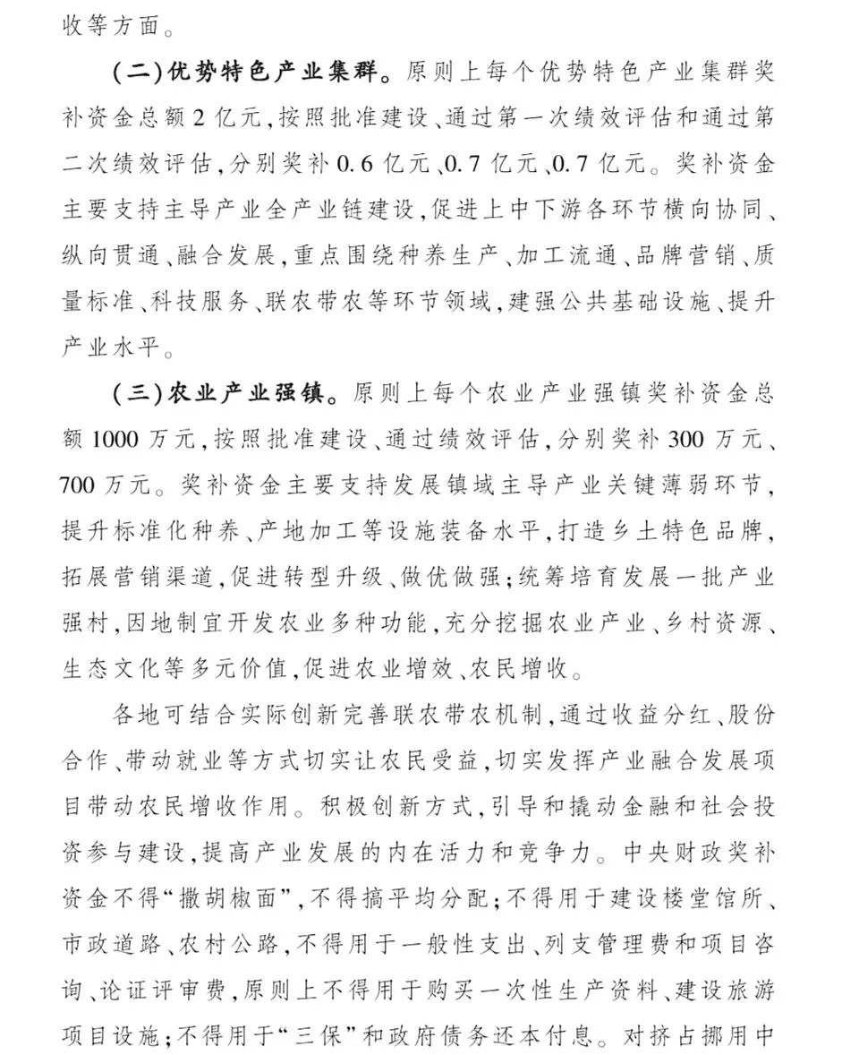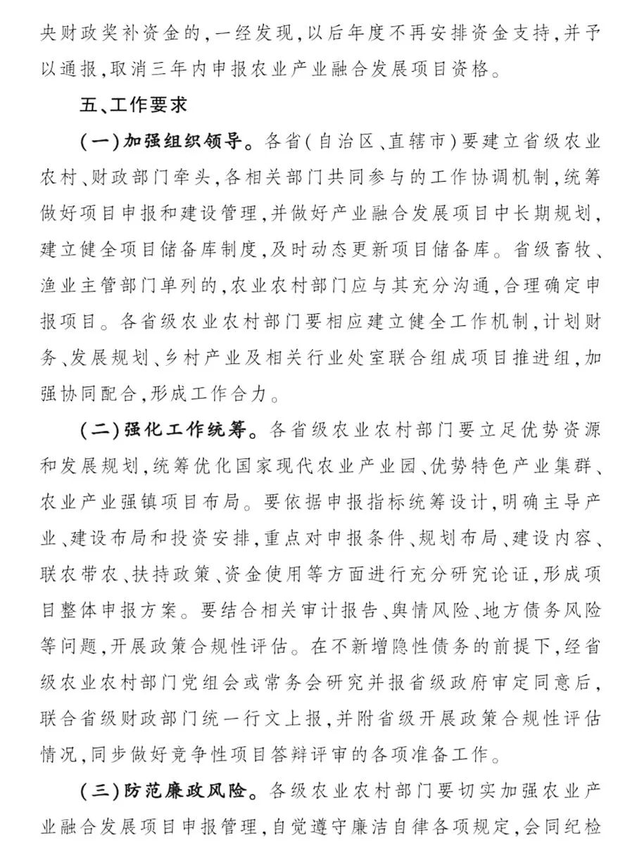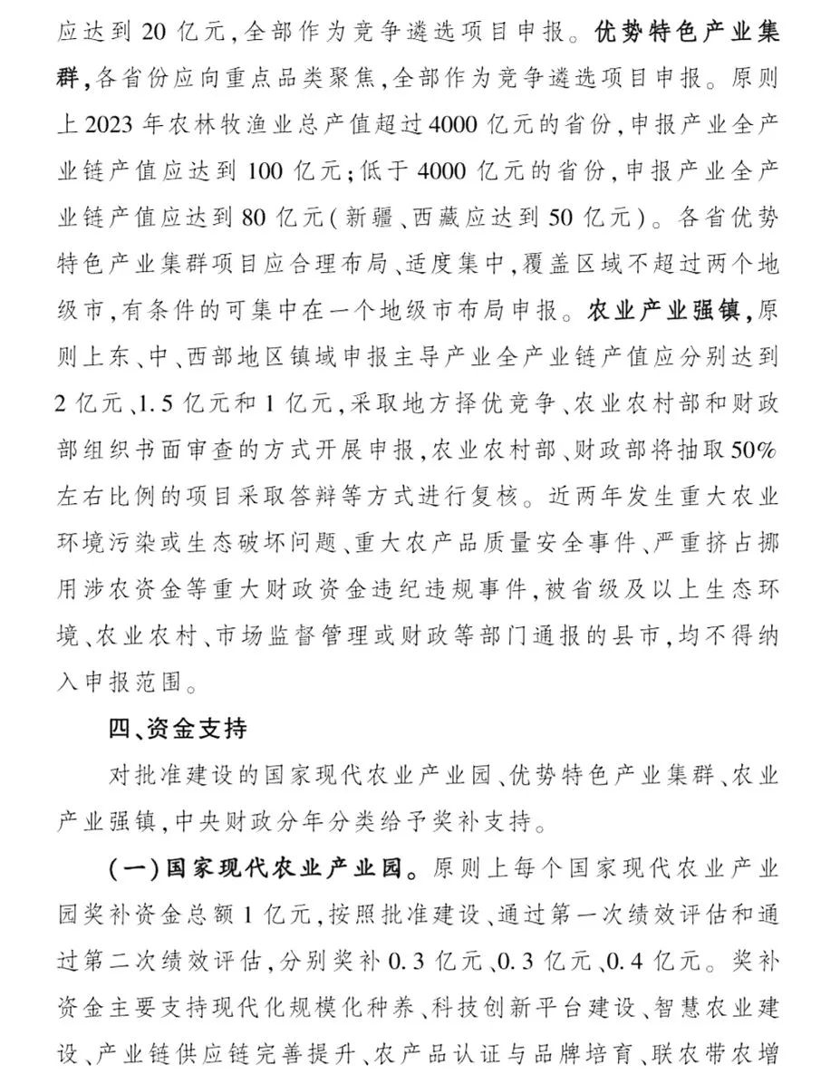 1.國家現(xiàn)代農(nóng)業(yè)產(chǎn)業(yè)園全部作為競爭遴選項目申報,優(yōu)勢特色產(chǎn)業(yè)集群全部作為競爭遴選項目申報,農(nóng)業(yè)產(chǎn)業(yè)強鎮(zhèn)采取地方擇優(yōu)競爭、農(nóng)業(yè)農(nóng)村部和財政部組織書面審查的方式開展申報。