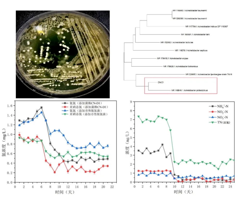 針對上述問題,研究團隊分離并鑒定了一株不動桿菌(Acinetobacter sp.)CN-D1菌株,保藏編號為CCTCC NO:M 20242023。CN-D1是一種同步硝化反硝化菌,能夠同時除去水體中的總氮、氨氮、亞硝酸鹽等物質(zhì);同時環(huán)境耐受性強,可以應(yīng)用于循環(huán)養(yǎng)殖水體和養(yǎng)殖尾水中,發(fā)揮生物脫氮的作用。在實際應(yīng)用中,循環(huán)水養(yǎng)殖系統(tǒng)中投加CN-D1菌劑后,水體中的氨氮和亞硝態(tài)氮的去除率分別可以達到70.8% 和69.2%。針對尾水中的高濃度污染物(NH4+-N 3.5 mg/L、TN 6.9 mg/L),連續(xù)投加菌劑后10天內(nèi),各項指標(biāo)均大幅下降,穩(wěn)定時的NH4+-N、NO??-N以及TN的去除率分別可以達到86.5%、81.7%和71.0%??偟膩碚f,該研究為我國循環(huán)水養(yǎng)殖系統(tǒng)水處理提供了新的菌種資源,有效減少循環(huán)水養(yǎng)殖系統(tǒng)水處理的成本。