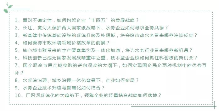 十九大以來(lái),中國(guó)特色社會(huì)主義進(jìn)入新時(shí)代,我國(guó)經(jīng)濟(jì)也進(jìn)入了由高速增長(zhǎng)階段轉(zhuǎn)向高質(zhì)量發(fā)展階段的新時(shí)期。伴隨著生態(tài)文明建設(shè)日益加強(qiáng),“兩山理論”的逐步深化落地,水務(wù)行業(yè)亦從以環(huán)境治理效果為核心向“生態(tài)價(jià)值聯(lián)動(dòng)”升級(jí),同步開(kāi)啟由“綜合治理”向“系統(tǒng)性治理”的升級(jí)。水務(wù)行業(yè)資本拉動(dòng)時(shí)代結(jié)束,服務(wù)增值時(shí)代來(lái)臨。在此背景下,以“迭代創(chuàng)新 共生未來(lái)”為主題,由 E20 環(huán)境平臺(tái)主辦的“2020(第十八屆)水業(yè)戰(zhàn)略論壇”將于6月12-13日在北京友誼賓館友誼宮聚英廳舉辦。論壇將解讀當(dāng)前經(jīng)濟(jì)、政策、產(chǎn)業(yè)發(fā)展等宏觀形勢(shì);探討變革下的企業(yè)應(yīng)對(duì)之策、技術(shù)創(chuàng)新、服務(wù)時(shí)代回歸等業(yè)內(nèi)最具關(guān)注性的行業(yè)話題。談什么?聚焦行業(yè)十大熱點(diǎn)話題國(guó)資入股、民企易主,產(chǎn)業(yè)格局不斷重構(gòu);長(zhǎng)江、黃河大保護(hù),產(chǎn)業(yè)空間漸次釋放,企業(yè)合作逐漸增強(qiáng);跨界“老鐵”又來(lái),智慧色彩愈濃;省級(jí)環(huán)保集團(tuán)登場(chǎng),政府聯(lián)動(dòng)國(guó)有資本信步走來(lái);科創(chuàng)板上市,資本路徑更多元;污水提標(biāo)增效,治理更精準(zhǔn);新基建、專項(xiàng)債加碼,“十四五”環(huán)境治理再升級(jí)...... 水務(wù)行業(yè)的每一次變化都牽動(dòng)著環(huán)境產(chǎn)業(yè)人士的神經(jīng)。水務(wù)市場(chǎng)中有哪些廣為關(guān)注的熱點(diǎn)話題?本屆論壇特別策劃了以下十大熱點(diǎn)話題,論壇上將展開(kāi)詳細(xì)討論。鄭展望:雙良商達(dá)發(fā)酵強(qiáng)化技術(shù)6月13日(論壇第二天)上午10:55,浙江省環(huán)境科學(xué)學(xué)會(huì)農(nóng)村環(huán)境專業(yè)委員會(huì)主任、浙江農(nóng)林大學(xué)農(nóng)村環(huán)境研究所所長(zhǎng)、浙江雙良商達(dá)環(huán)保有限公司董事長(zhǎng)鄭展望教授將以《農(nóng)村污水治理4.0之發(fā)酵強(qiáng)化》為主題進(jìn)行精彩分享,敬請(qǐng)期待。(部分精彩演講內(nèi)容提前看↓↓↓)誰(shuí)會(huì)來(lái)?行業(yè)大咖齊聚一堂行業(yè)大咖齊聚一堂,分享業(yè)內(nèi)最新發(fā)展形勢(shì)!每年的水業(yè)戰(zhàn)略論壇參會(huì)嘉賓都吸引著大家的密切關(guān)注,今年都有哪些大咖會(huì)來(lái)呢,你想獲得哪位大咖的聯(lián)系方式呢?論壇將邀請(qǐng)行業(yè)領(lǐng)跑企業(yè)決策者、環(huán)保上市公司代表、政府官員、專家學(xué)者、行業(yè)研究機(jī)構(gòu)代表、行業(yè)媒體及水務(wù)領(lǐng)域的關(guān)注者,共同探討水業(yè)戰(zhàn)略布局,深度交流行業(yè)熱點(diǎn),預(yù)判環(huán)境產(chǎn)業(yè)未來(lái)。在此先給大家奉上部分嘉賓名單! 附:部分嘉賓(排名不分先后)