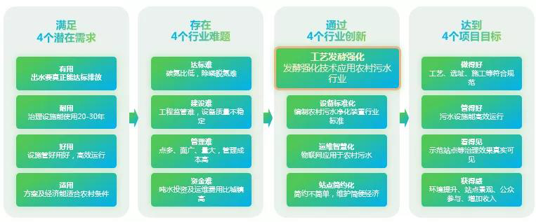 農(nóng)村污水治理4.0農(nóng)村污水治理4.0是一個系統(tǒng),其內(nèi)涵概況起來,主要包含了4個“4”,分別為滿足4個潛在需求、存在4個行業(yè)難題、通過4個行業(yè)創(chuàng)新、達(dá)到4個項目目標(biāo),最終要達(dá)到的是提升村民獲得感,也是農(nóng)村人居環(huán)境建設(shè)的出發(fā)點和落腳點。