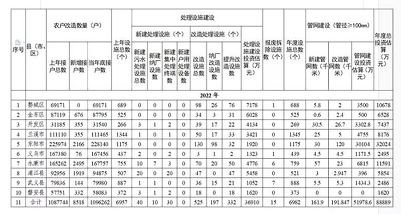2022年,全市新建改造農(nóng)村生活污水集中處理設(shè)施362個(gè),新增納廠設(shè)施207個(gè),新增受益農(nóng)戶8518戶;農(nóng)村生活污水治理行政村覆蓋率達(dá)到84%,出水水質(zhì)達(dá)標(biāo)率達(dá)到76%;實(shí)現(xiàn)既有處理設(shè)施標(biāo)準(zhǔn)化運(yùn)維全覆蓋。