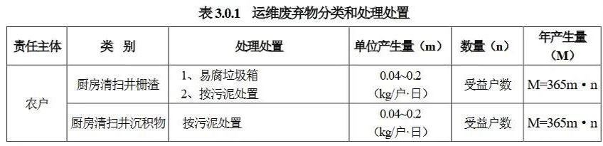 3.0.4 運(yùn)維廢棄物應(yīng)按廢棄物種類、性質(zhì)和數(shù)量選擇合理的處置方式,可分為納入農(nóng)村垃圾系統(tǒng)、污泥處理廠處理、有機(jī)廢棄物處理處置中心處理、糞便處理廠和專業(yè)公司回收處理等方式。