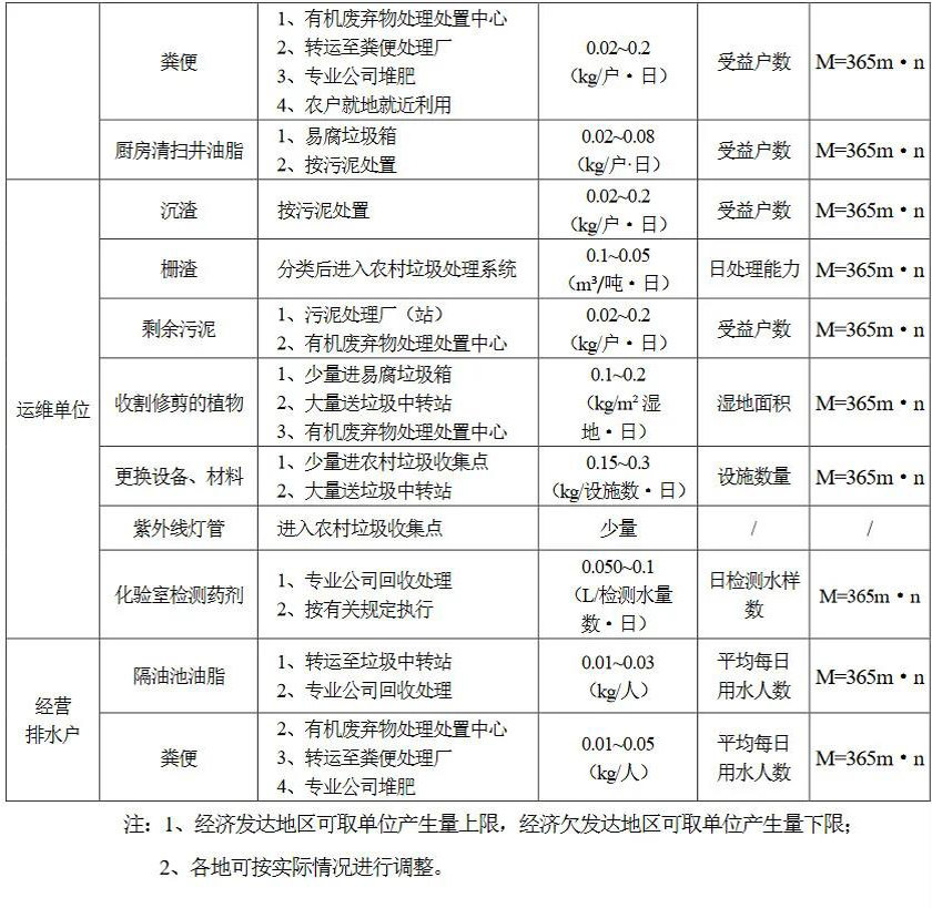 農(nóng)村生活污水處理設(shè)施運(yùn)行維護(hù)過程中產(chǎn)生的廢棄物,包括固體清掏物、油脂、剩余污泥、濕地收割的植物、廢棄填料及其他運(yùn)維雜物等。