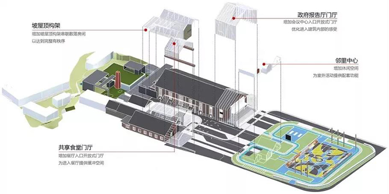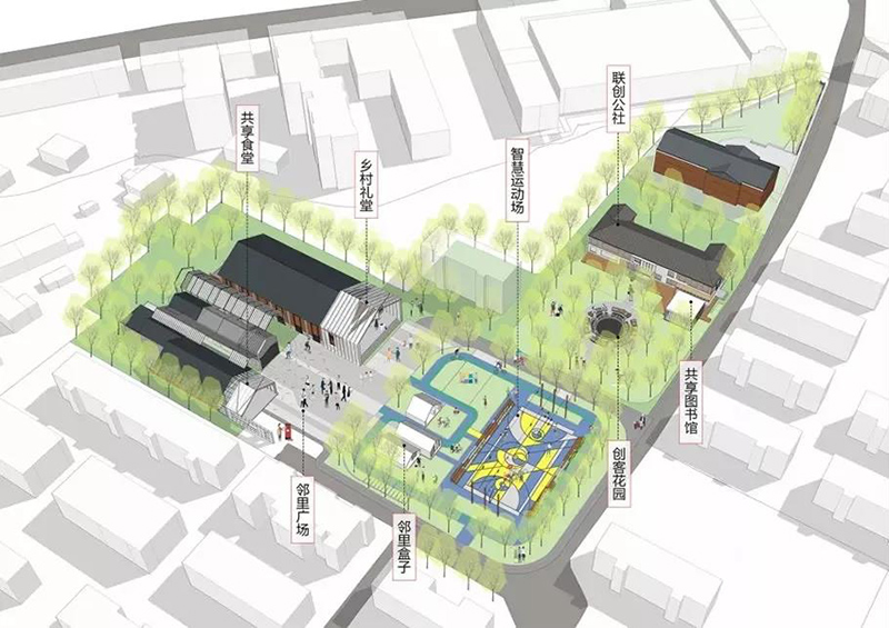 對(duì)于這樣一個(gè)以工業(yè)遺存為主的舊改項(xiàng)目,溪口未來社區(qū)以“溪口公社·快樂老家”為主旨,提出了“鄉(xiāng)里、鄉(xiāng)味、鄉(xiāng)情、鄉(xiāng)鄰、鄉(xiāng)業(yè)、鄉(xiāng)教、鄉(xiāng)健、鄉(xiāng)談”的“八鄉(xiāng)”改造策略,而這些場景活化的振興策略則在遍布社區(qū)中的共享食堂、鄉(xiāng)村禮堂、智慧運(yùn)動(dòng)場、聯(lián)創(chuàng)公社、鄰里廣場、鄰里盒子、創(chuàng)客空間和共享圖書館等社區(qū)公共空間有所體現(xiàn)。