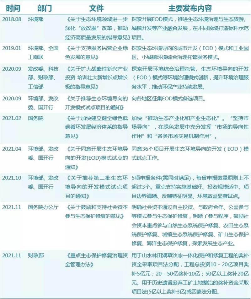 于是,基于項(xiàng)目實(shí)踐的EOD模式應(yīng)運(yùn)而生。環(huán)境部從2018年即開始提出了EOD模式的倡議,時(shí)至今年,多部委陸續(xù)出臺(tái)EOD相關(guān)政策,中央重視程度逐增。