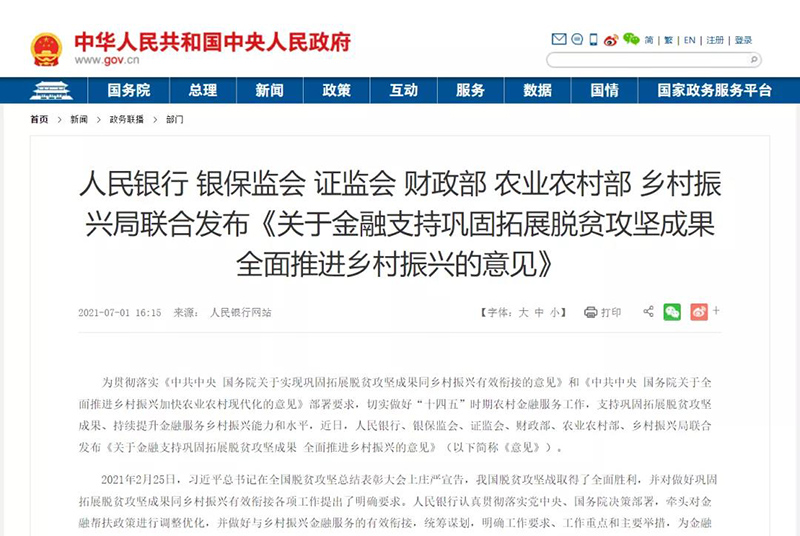 中國(guó)人民銀行等六部門聯(lián)合發(fā)布了《關(guān)于金融支持鞏固拓展脫貧攻堅(jiān)成果 全面推進(jìn)鄉(xiāng)村振興的意見》