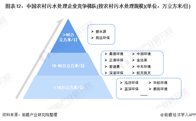 根據(jù)企業(yè)的農(nóng)村污水處理總規(guī)模劃分,可分為三個梯隊,第一梯度為農(nóng)村污水處理總規(guī)模在80萬立方米/日以上的企業(yè),有碧水源、商達(dá)環(huán)保。第二梯隊為農(nóng)村污水處理總規(guī)模在18-80萬立方米/日以上的企業(yè),包括桑德環(huán)境、正清環(huán)保、愛迪曼、金達(dá)萊、深港環(huán)保、中車環(huán)境、中測環(huán)境和航天凱天。第三梯隊為農(nóng)村污水處理總規(guī)模在小于18萬立方米/日的企業(yè),代表性企業(yè)有泓濟環(huán)保、華航環(huán)境、藍(lán)神環(huán)保、鵬凱環(huán)境等。