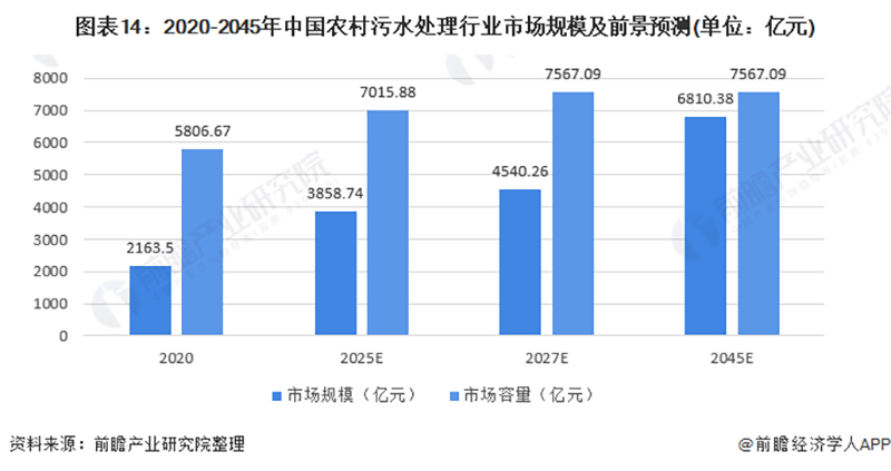 經(jīng)綜合考慮不同節(jié)點我國對農(nóng)村污水處理行業(yè)的相關(guān)規(guī)劃及污水處理收費標(biāo)準(zhǔn),前瞻預(yù)計2025年我國農(nóng)村污水處理率將達(dá)55%,污水處理價格將在0.85元/噸以上,2027年污水處理率達(dá)60%,而至2045年,處理率將達(dá)90%。以此測算,我國農(nóng)村污水處理規(guī)模在2027年將達(dá)4540.26億元,至2045年,市場規(guī)模達(dá)6810.38億元,潛在市場總體容量空間在7567.09億元左右。