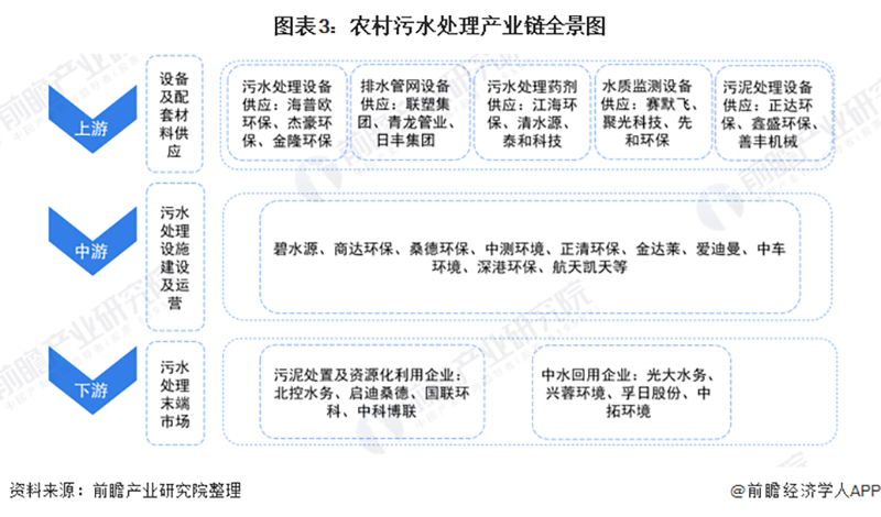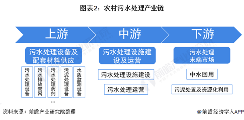農(nóng)村污水處理行業(yè)上游供應(yīng)商一般為污水處理設(shè)備及配套材料供應(yīng);中游主要是農(nóng)村污水處理設(shè)施建設(shè),以及農(nóng)村污水處理設(shè)施建設(shè)后的運營、管理、監(jiān)督、維護(hù)以及其他管理性質(zhì)工作,如污水處理設(shè)施的服務(wù)外包,多種形式的委托經(jīng)營等;下游為污水處理末端市場,如中水回用、污泥處置及資源化利用等。