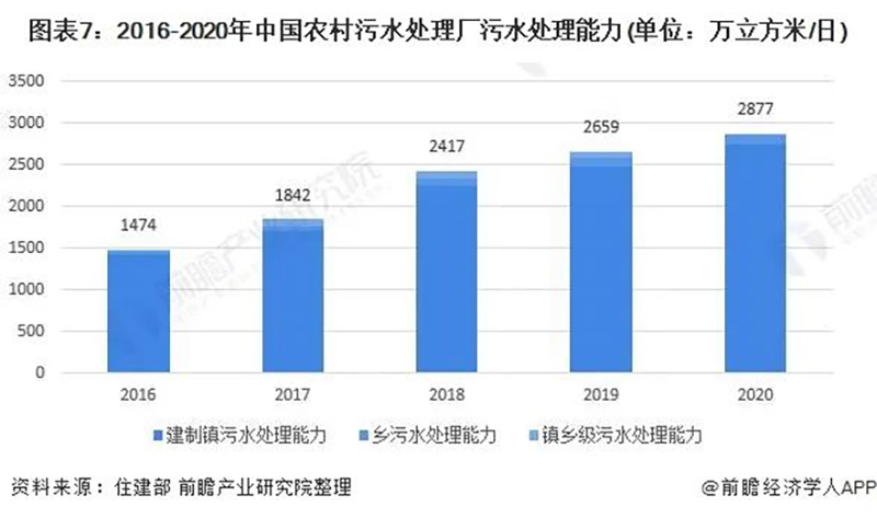 近年來,得益于“十三五”規(guī)劃對我國生態(tài)環(huán)境保護(hù)和水污染治理的政策支持,以及財政部在資金投入上的持續(xù)加碼,我國農(nóng)村污水處理產(chǎn)業(yè)資源快速增長,截至2020年,我國有記錄的建制鎮(zhèn)、鄉(xiāng)及鎮(zhèn)鄉(xiāng)特殊區(qū)域累計擁有污水處理廠13714個,污水處理廠污水處理能力達(dá)2877萬立方米/日。