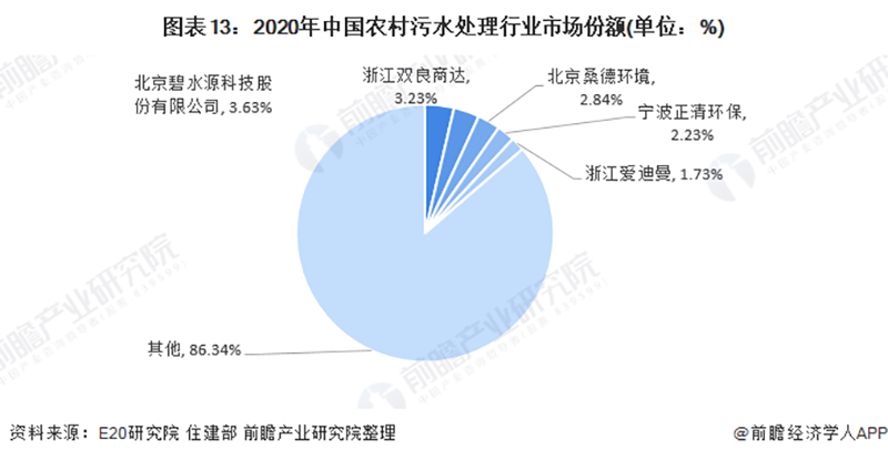 從農(nóng)村污水處理市場份額上看,北京碧水源科技股份有限公司村鎮(zhèn)污水處理項目總規(guī)模全國排名第一,市占率約為3.63%;其次是浙江雙良商達(dá)環(huán)保有限公司、北京桑德環(huán)境工程有限公司、寧波正清環(huán)保工程有限公司和浙江愛迪曼環(huán)??萍脊煞萦邢薰?,市占率分別為3.23%、2.84%、2.23%和1.73%。