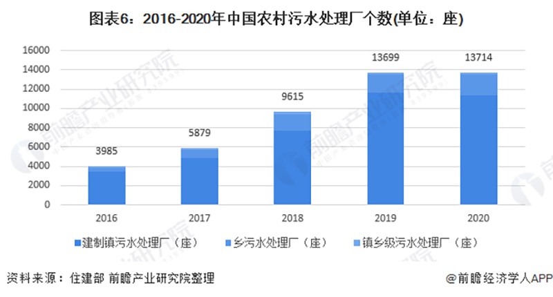 從污水處理基礎(chǔ)設(shè)施建設(shè)方面看,“十三五”期間我國農(nóng)村污水處理廠數(shù)量規(guī)模快速增長,截至2020年底,我國共有農(nóng)村污水處理廠13714座,其中建制鎮(zhèn)污水處理廠數(shù)量11374座,鄉(xiāng)污水處理廠2170座,鎮(zhèn)鄉(xiāng)級區(qū)域污水處理廠170座。