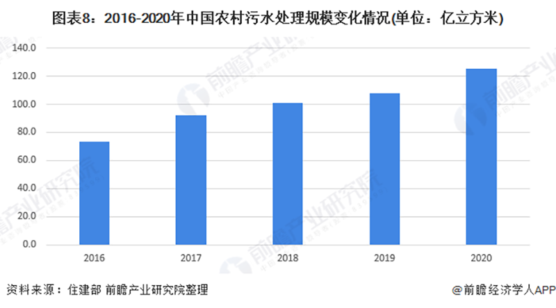 我國農(nóng)村村莊污水處理較為復(fù)雜,處理率常年來處于較低水平,且住建部年鑒統(tǒng)計數(shù)據(jù)僅公布建制鎮(zhèn)、鄉(xiāng)和鎮(zhèn)鄉(xiāng)區(qū)域污水處理率,前瞻結(jié)合我國農(nóng)村污水處理現(xiàn)狀,假定村莊污水處理率接近于鄉(xiāng)級污水處理率,以此測算,我國農(nóng)村污水處理規(guī)模如下:
