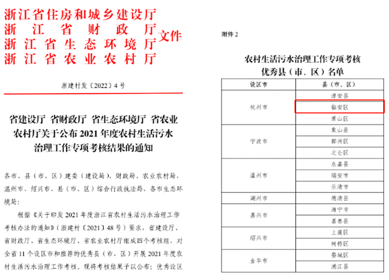 近日,浙江省住建廳公布了2021年度農(nóng)村生活污水治理工作專項考核結(jié)果。臨安區(qū)農(nóng)村生活污水治理工作圓滿完成了各項工作任務(wù),獲得了2021年度全省農(nóng)村生活污水治理工作專項考核優(yōu)秀區(qū)縣榮譽。