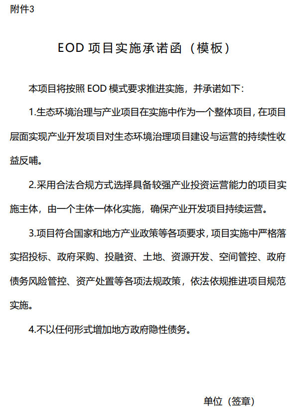 (四)EOD項(xiàng)目應(yīng)一并提交EOD項(xiàng)目實(shí)施方案(編制大綱見附件2)與承諾函(模板見附件3)。承諾函由項(xiàng)目申報(bào)主體和實(shí)施主體(市級(jí)及以下人民政府或園區(qū)管委會(huì))蓋章。