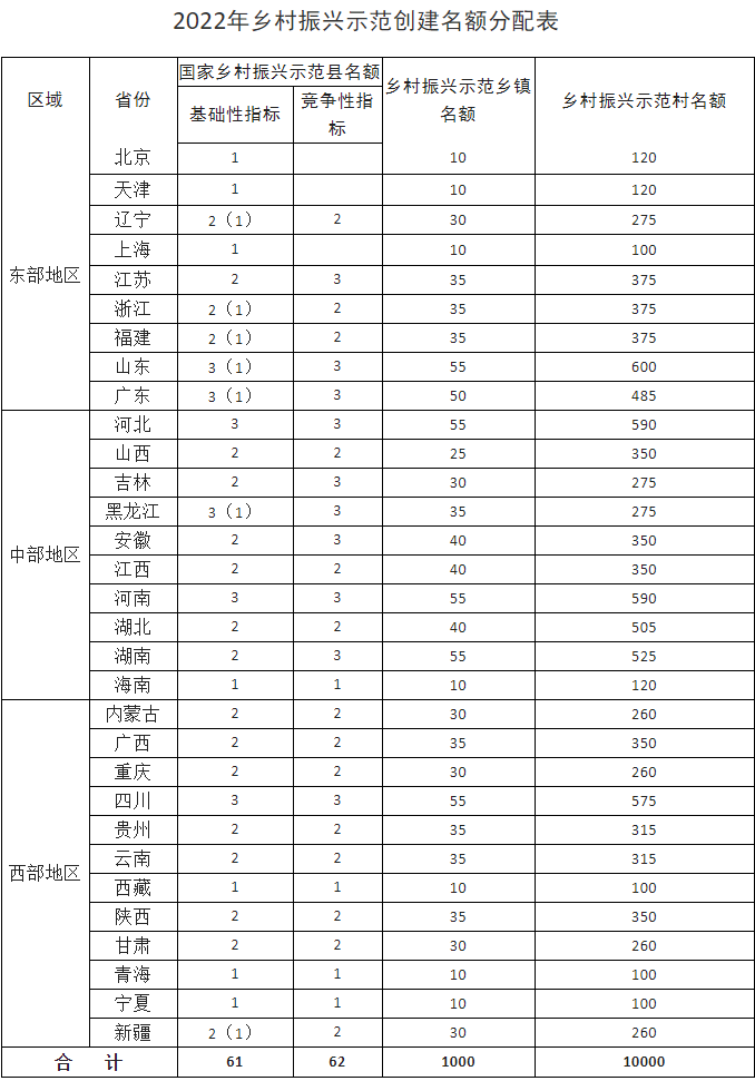 2022年,立足縣、鄉(xiāng)、村資源稟賦和發(fā)展基礎(chǔ),體現(xiàn)東、中、西部區(qū)域特色,農(nóng)業(yè)農(nóng)村部、國家鄉(xiāng)村振興局組織創(chuàng)建100個(gè)左右國家鄉(xiāng)村振興示范縣,省級(jí)農(nóng)業(yè)農(nóng)村部門、鄉(xiāng)村振興局組織創(chuàng)建1000個(gè)左右鄉(xiāng)村振興示范鄉(xiāng)鎮(zhèn)、10000個(gè)左右鄉(xiāng)村振興示范村,分層級(jí)推進(jìn)示范創(chuàng)建。力爭用5年左右時(shí)間,開展創(chuàng)建工作的國家鄉(xiāng)村振興示范縣基本覆蓋全國各市(地、州、盟)。各地要結(jié)合年度重點(diǎn)工作部署,扎實(shí)推進(jìn)示范創(chuàng)建工作。