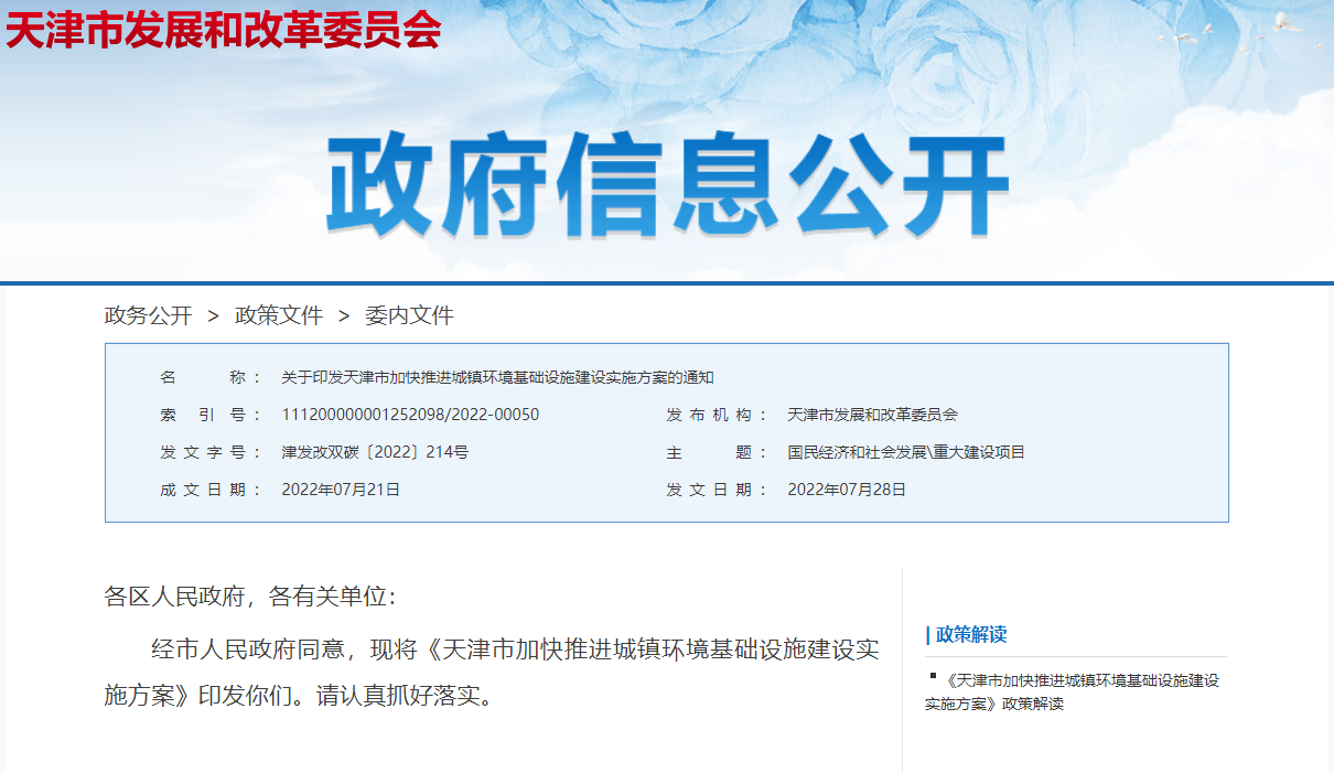 為加快推進(jìn)本市城鎮(zhèn)環(huán)境基礎(chǔ)設(shè)施建設(shè),提升基礎(chǔ)設(shè)施現(xiàn)代化水平,推動(dòng)生態(tài)文明建設(shè)和綠色發(fā)展,日前,天津市發(fā)展改革委、市生態(tài)環(huán)境局、市水務(wù)局、市城市管理委、市衛(wèi)生健康委等5個(gè)部門共同發(fā)布《天津市加快推進(jìn)城鎮(zhèn)環(huán)境基礎(chǔ)設(shè)施建設(shè)實(shí)施方案》?!斗桨浮?/span>圍繞污水、垃圾、固體廢物、危險(xiǎn)廢物、醫(yī)療廢物處理處置,提出我市城鎮(zhèn)環(huán)境基礎(chǔ)設(shè)施建設(shè)的主要目標(biāo)及具體落實(shí)措施。