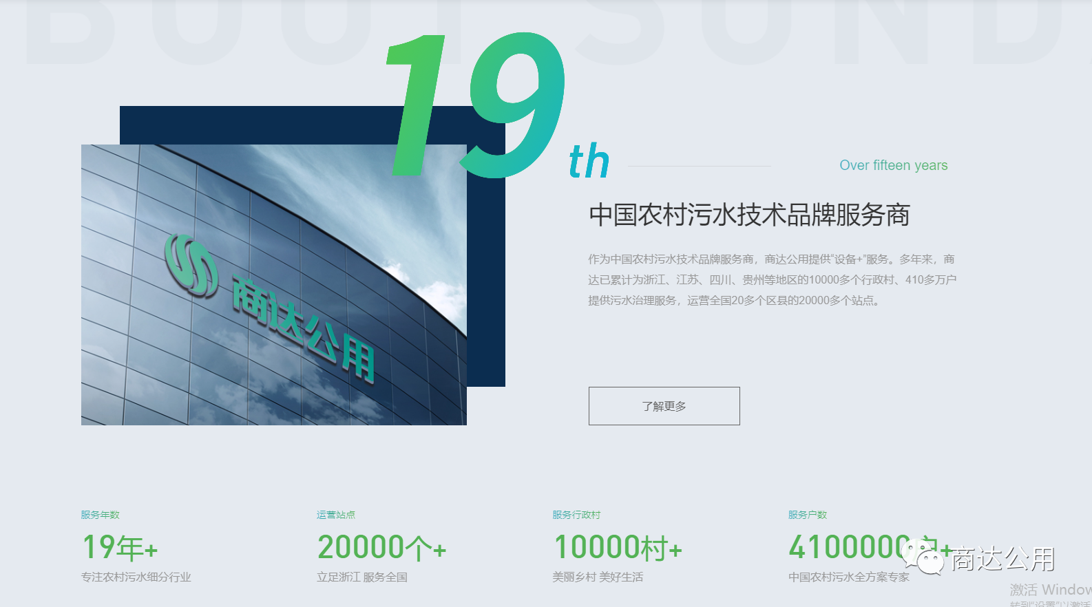 2021年度(第十九屆)水業(yè)企業(yè)評選頒獎典禮 作為山東公用集團在鄉(xiāng)村環(huán)境領域的投資發(fā)展平臺,商達定位為中國農(nóng)村污水技術品牌服務商。19年來,已累計為全國410萬戶1200萬人提供污水治理服務,運營全國20個區(qū)縣的20000個站點。2019年,在E2O的村鎮(zhèn)污水處理年度盤點中,商達公用農(nóng)村污水處理總規(guī)模、設備供應總規(guī)模處于全國第一。近兩年,商達也先后被評為農(nóng)村污水 “隱形冠軍”培育企業(yè)、“瞪羚企業(yè)”、“專精特新”企業(yè)等。 商達“設備+整體方案”