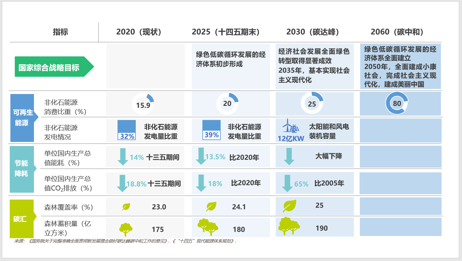 2021年10月,中國向聯(lián)合國提交了最新的國家自主貢獻(NDC)和長期排放控制戰(zhàn)略。根據(jù)中國最新的NDC,除了延續(xù)2015年提出的2030碳達峰目標,中國進一步強調(diào)了在2060年實現(xiàn)碳中和的承諾。此次國家自主貢獻還把2030年碳排放強度減排目標(以2005年為基準)從原來60%-65%提高到65%以上,雙碳目標已經(jīng)納入國家總體發(fā)展戰(zhàn)略。