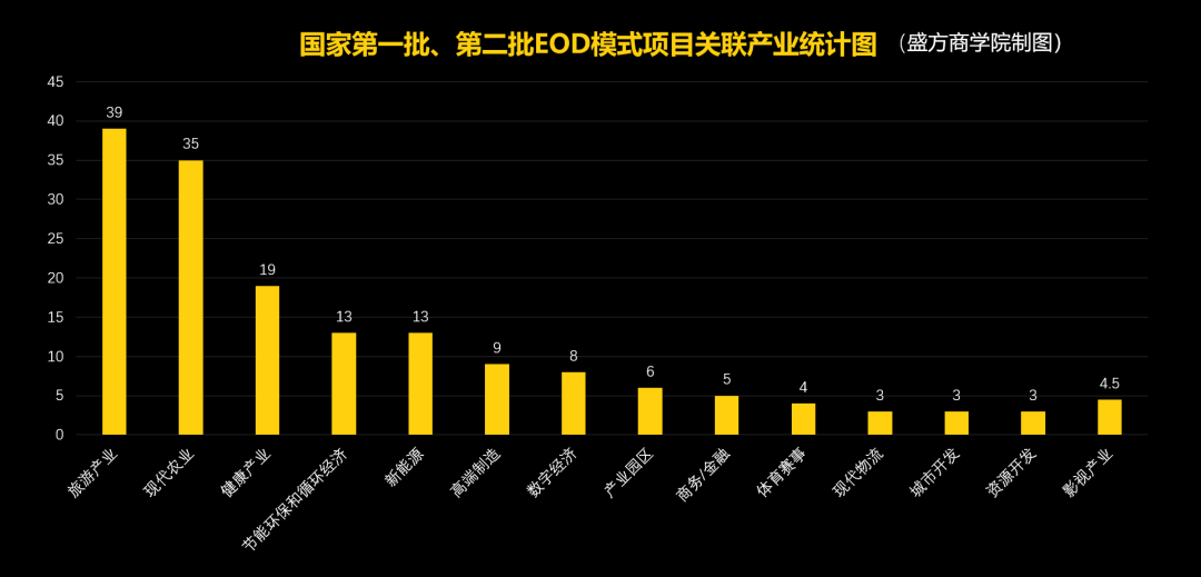 ③關(guān)聯(lián)產(chǎn)業(yè)2021年生態(tài)環(huán)境部發(fā)布的《一圖讀懂EOD模式與試點實踐》中,對EOD項目的產(chǎn)業(yè)選擇原則進(jìn)行描述,強(qiáng)調(diào)“發(fā)展契合當(dāng)?shù)厣鐣?jīng)濟(jì)發(fā)展實際、生態(tài)環(huán)境關(guān)聯(lián)度高、項目收益能力強(qiáng)的產(chǎn)業(yè)”。小編為大家梳理第一批、第二批國家EOD試點項目的關(guān)聯(lián)產(chǎn)業(yè),其中旅游產(chǎn)業(yè)、現(xiàn)代農(nóng)業(yè)和健康產(chǎn)業(yè)位居前三。