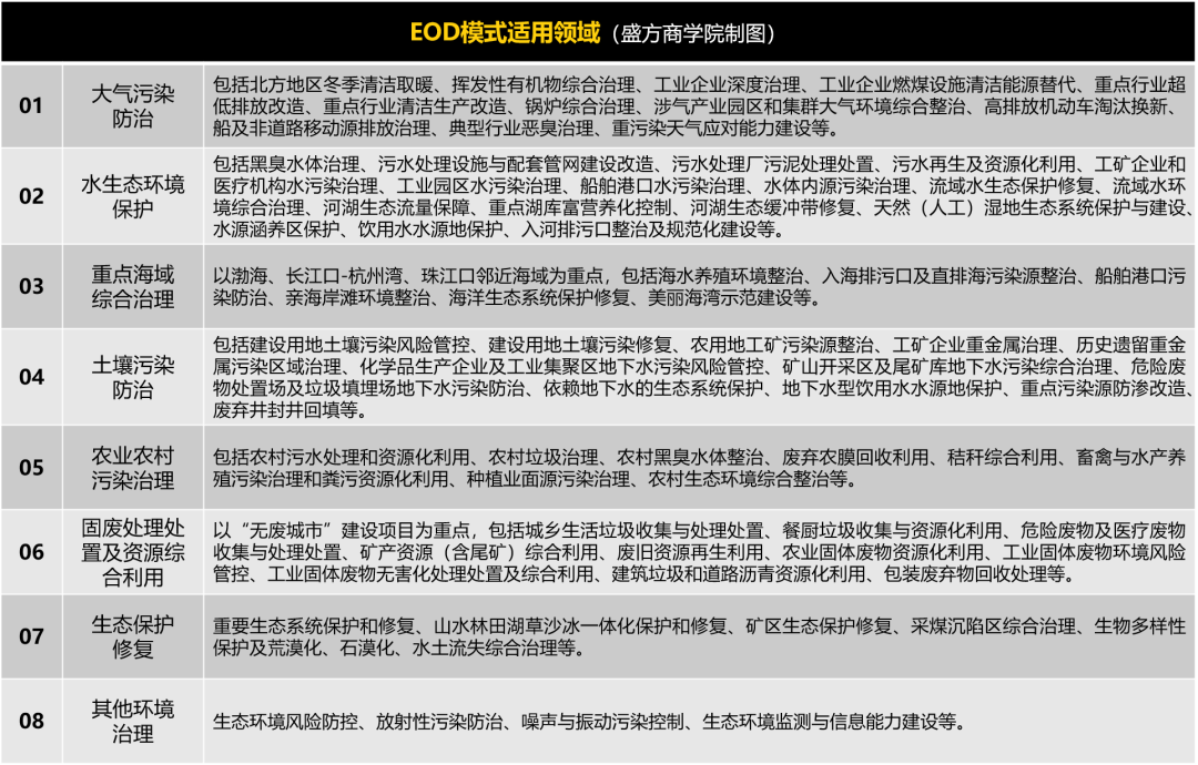 2022年發(fā)布的《生態(tài)環(huán)保金融支持項目儲備庫入庫指南(試行)》(環(huán)辦科財〔2022〕6號)文件中,EOD入庫項目應(yīng)屬于以下8大領(lǐng)域: