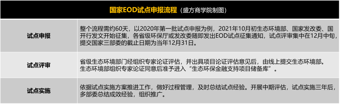 2018年8月,生態(tài)環(huán)境部發(fā)布《關(guān)于生態(tài)環(huán)境領(lǐng)域進(jìn)一步深化“放管服”改革,推動經(jīng)濟(jì)高質(zhì)量發(fā)展的指導(dǎo)意見》(環(huán)規(guī)財〔2018〕86號)首次提出EOD模式以后,生態(tài)環(huán)境部、國家發(fā)改委、國家開發(fā)銀行分別在2020年9月、2021年10月開展兩次EOD試點征集工作。從2022年開始,從之前的試點申報制轉(zhuǎn)為常態(tài)入庫制。