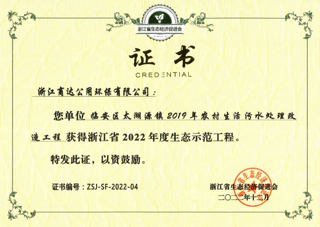 近日,浙江省生態(tài)經(jīng)濟促進會開展了浙江省2022年度生態(tài)示范工程評選活動。獎項均由浙江省生態(tài)經(jīng)濟促進會發(fā)起,旨在進一步推動浙江省生態(tài)經(jīng)濟產(chǎn)業(yè)的發(fā)展,增強企業(yè)的綜合競爭力,表彰在浙江省生態(tài)經(jīng)濟產(chǎn)業(yè)發(fā)展中引領(lǐng)示范的會員單位。在此次評選中,商達公用臨安區(qū)農(nóng)污提標(biāo)及第三方運維項目獲評“浙江省2022年度生態(tài)示范工程”。