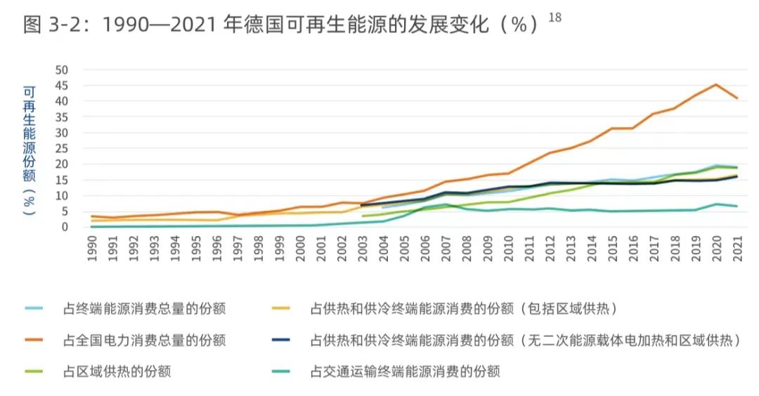 德國是全球能源轉(zhuǎn)型的先驅(qū)之一,也是能源結(jié)構(gòu)較好的國家。2021年,德國可再生能源占終端能源消費總量的19.2%,占終端電力消費總量的41.1%(2021年是"小風(fēng)年"),占區(qū)域供熱的18.8%,占供熱和供冷的16.5%(包括區(qū)域供熱),占終端交通運輸消費總量的6.8%。德國的目標(biāo)是:在2030年之前實現(xiàn)可再生能源供給滿足80%的電力需求和50%的熱力需求。