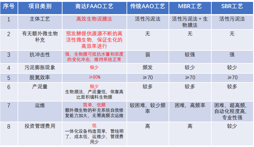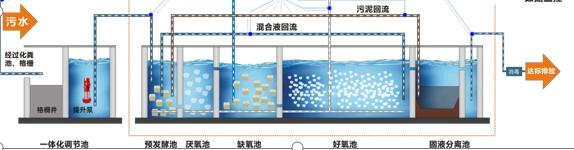 1.0—工程化:工程思維。第一代主要是實(shí)現(xiàn)污水治理功能。工藝 集成度高,但施工周期長(zhǎng),隱蔽工程多, 現(xiàn)場(chǎng)質(zhì)量難以保障,內(nèi)部填料需要定期 更換,加大了運(yùn)維難工作量。 2.0—產(chǎn)品化:產(chǎn)品思維。商達(dá)開(kāi)展農(nóng)村污水處置終端的產(chǎn)品化在 業(yè)界是比較早的。在2008年開(kāi)始針對(duì) 土建施工復(fù)雜等問(wèn)題進(jìn)行了成套化、設(shè) 備化改造。產(chǎn)品多以玻璃鋼為材料,采 用半手工纏繞。 3.0—工業(yè)化:工業(yè)思維。這一代產(chǎn)品進(jìn)行工業(yè)化改造。包括標(biāo) 準(zhǔn)化、規(guī)?;?、低成本等。因此,第 三代產(chǎn)品生產(chǎn)方式由手工改為模壓工 廠標(biāo)準(zhǔn)化生產(chǎn),質(zhì)量更可靠。 4.0—發(fā)酵強(qiáng)化:效果思維。商達(dá)第四代設(shè)備就是在闡明環(huán)境功能微生物代謝特征基礎(chǔ)上,重新認(rèn)識(shí)微生物發(fā)酵過(guò)程,通過(guò)精細(xì)調(diào)控,強(qiáng)化微生物在農(nóng)村污水處 理工藝中的效率。 5.0—生態(tài)化:低碳思維。這一代設(shè)備目前還處于研發(fā)示范階段,我們已經(jīng)在浙江臨安指南村等項(xiàng)目上進(jìn)行示范展示。其特點(diǎn)是,站在碳中和與鄉(xiāng)村振興的維 度來(lái)考慮農(nóng)村污水治理,而不單以治污水一個(gè)角度,治理過(guò)程中和農(nóng)村生態(tài)、生產(chǎn)、生活相融合,具備資源化利用的功能。 6.0—智慧化 (構(gòu)想):“元宇宙” 思維。這一代設(shè)備擬倚仗強(qiáng)大的終端和后臺(tái)支持,解決的不僅僅只是污水智能控制,還包括農(nóng)村環(huán)境監(jiān)測(cè)、智慧農(nóng)業(yè)、閉環(huán)循環(huán)利用等多個(gè)方面,將技術(shù)體系、運(yùn)營(yíng)體系和產(chǎn)業(yè)系統(tǒng)有機(jī)融合,更好地服務(wù)未來(lái)的美麗鄉(xiāng)村建設(shè)。FBR發(fā)酵槽有兩個(gè)顯著的特征,首先在上一代的基礎(chǔ)上進(jìn)行發(fā)酵強(qiáng)化改進(jìn),第二就是產(chǎn)品標(biāo)準(zhǔn)多樣性,可以根據(jù)客戶的要求,進(jìn)行有針 對(duì)性地設(shè)計(jì),以滿足不同省份出水標(biāo)準(zhǔn)的要求。其中,強(qiáng)化型FRB發(fā)酵槽的出水水質(zhì)可達(dá)到地表準(zhǔn)Ⅳ類水標(biāo)準(zhǔn)。FBR發(fā)酵槽采用FAAO發(fā)酵強(qiáng)化工藝,在提高建設(shè)速度的同時(shí)可以保證出水穩(wěn)定達(dá)標(biāo)。其中F表示:發(fā) 酵 Fermentation;B表示:生物膜 Biofilm R表示:反應(yīng)器 Reactor,F(xiàn)AAO發(fā)酵強(qiáng)化工藝是一種基于厭氧/ 缺氧/好氧(AAO)生化組合,利用發(fā)酵技術(shù),強(qiáng)化脫氮除磷功能的移動(dòng)床生物膜工藝。