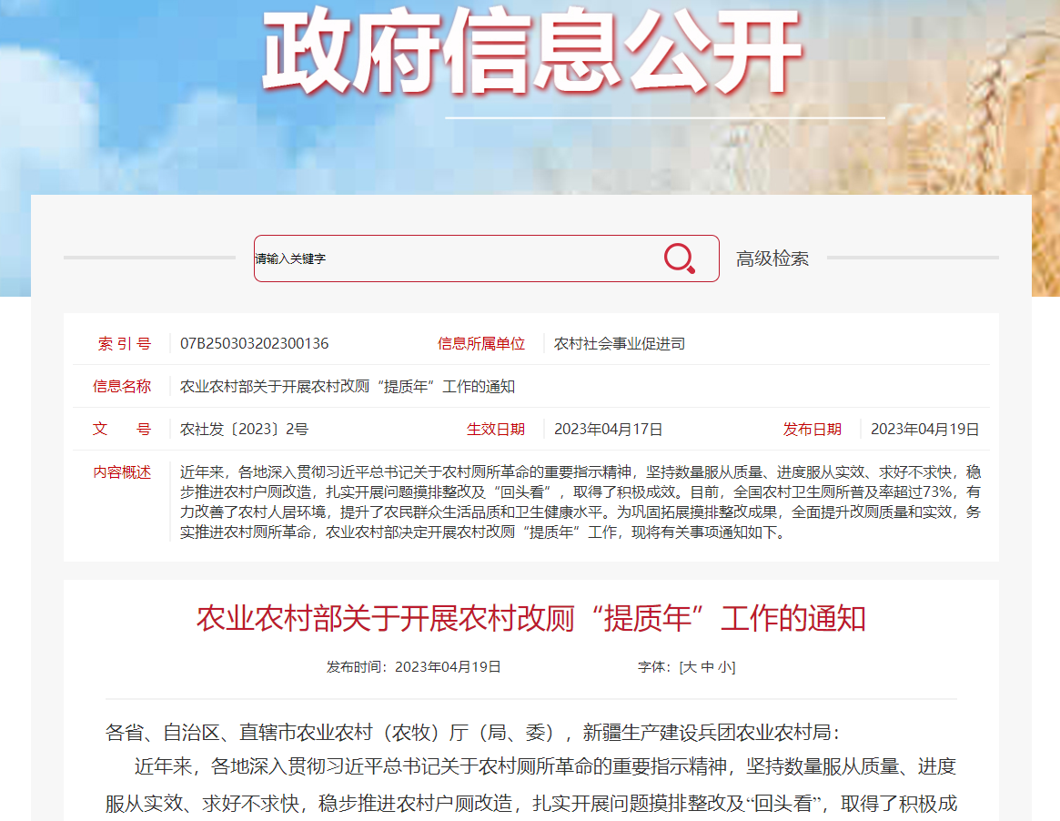 各省、自治區(qū)、直轄市農(nóng)業(yè)農(nóng)村(農(nóng)牧)廳(局、委),新疆生產(chǎn)建設兵團農(nóng)業(yè)農(nóng)村局:近年來,各地深入貫徹習近平總書記關于農(nóng)村廁所革命的重要指示精神,堅持數(shù)量服從質(zhì)量、進度服從實效、求好不求快,穩(wěn)步推進農(nóng)村戶廁改造,扎實開展問題摸排整改及“回頭看”,取得了積極成效。目前,全國農(nóng)村衛(wèi)生廁所普及率超過73%,有力改善了農(nóng)村人居環(huán)境,提升了農(nóng)民群眾生活品質(zhì)和衛(wèi)生健康水平。為鞏固拓展摸排整改成果,全面提升改廁質(zhì)量和實效,務實推進農(nóng)村廁所革命,農(nóng)業(yè)農(nóng)村部決定開展農(nóng)村改廁“提質(zhì)年”工作,現(xiàn)將有關事項通知如下。通過開展農(nóng)村改廁“提質(zhì)年”工作,聚焦重點問題、緊盯薄弱環(huán)節(jié)、強化規(guī)范管理,推動工作機制不斷完善和工作作風進一步改進,推進問題廁所扎實整改、新建廁所質(zhì)量過硬、長效管護機制建立健全、財政資金使用安全有效、農(nóng)民群眾參與度滿意度明顯提高,切實提高農(nóng)村改廁工作質(zhì)量。