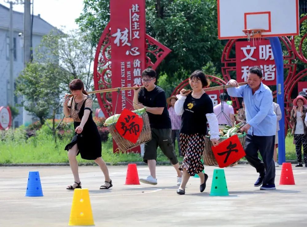 2023年6月21日,在湖州市長(zhǎng)興縣和平鎮(zhèn)長(zhǎng)崗村文化禮堂前廣場(chǎng),當(dāng)?shù)卮迕裾谶M(jìn)行挑擔(dān)子繞障礙物比賽。(徐昱 攝)
