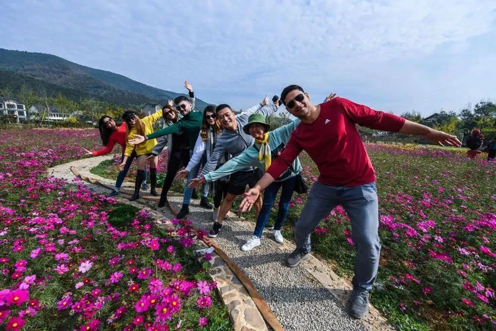 2019年11月6日,外國(guó)游客在湖州市長(zhǎng)興縣小浦鎮(zhèn)的千畝花海中合影。(徐昱 攝)