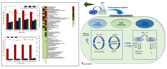 針對(duì)上述問題,研究團(tuán)隊(duì)分離并鑒定了一株具有油脂利用和高效脫氮能力的假單胞菌CYCN-C。菌株CYCN-C以KFOG為唯一碳源,TN的去除率可以達(dá)到73.5%。并且利用轉(zhuǎn)錄組技術(shù)分析了菌株CYCN-C分別以KFOG和乙酸鈉為碳源時(shí)的基因表達(dá)情況。結(jié)果顯示,KFOG組中部分基因表達(dá)水平顯著升高,其中包括參與碳代謝的細(xì)胞色素o泛醇氧化酶(cyo)、碳儲(chǔ)存調(diào)節(jié)蛋白基因(CsrA)、聚羥基烷酸酯(PHAs)和延胡索酸酶(FumC)基因分別上調(diào)6.9倍、0.7倍、26.0倍和19.0倍,參與氮代謝的硝酸還原酶(nar)和亞硝酸鹽還原酶(nirB、nirD)基因分別上調(diào)115倍、30倍和49倍,參與脂質(zhì)代謝途徑的脂肪酶(lipA、lipB)、甘油-3-磷酸脫氫酶(glpD)和甘油激酶(glpK)基因分別上調(diào)0.6倍、0.4倍、21.5倍和1.3倍。本研究驗(yàn)證了廢棄油脂作為碳源的可行性,并為該細(xì)菌利用廢棄油脂和脫氮的代謝機(jī)制提供了新的見解。