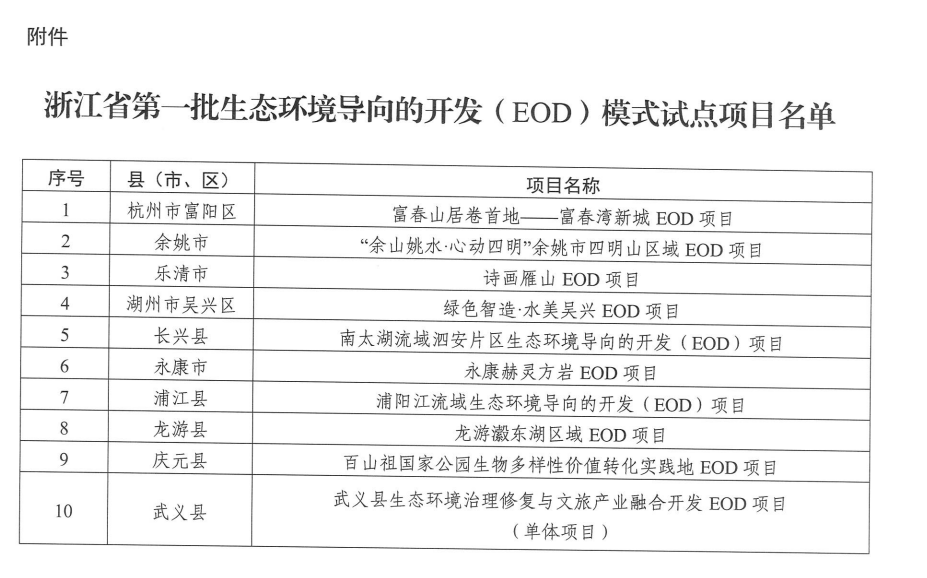 杭州市、寧波市、溫州市、湖州市、金華市、衢州市、麗水市 生態(tài)環(huán)境局、發(fā)展改革委,國家開發(fā)銀行浙江省分行、農(nóng)業(yè)發(fā)展銀行浙江省分行相關部門及分支機構(gòu),各試點實施單位: 為深入貫徹落實黨中央、國務院關于全面加強生態(tài)環(huán)境保護、深入打好污染防治攻堅戰(zhàn)的決策部署,持續(xù)推進環(huán)境治理模式創(chuàng)新,深入探索浙江省生態(tài)環(huán)境導向的開發(fā) (EOD) 模式實踐,打造綠色共富高地、助力推進“兩個先行”,根據(jù)《關于組織開展省級生態(tài)環(huán)境導向的開發(fā) (EOD) 模式試點工作的通知》(浙環(huán)函〔2023〕99 號)要求,對杭州市生態(tài)環(huán)境局等推薦的 EOD模式試點項目(以下簡稱試點項目)進行了審核。現(xiàn)將有關事項通知如下。 一、同意杭州市富陽區(qū)等10個項目(名單見附件)開展生態(tài)環(huán)境導向的開發(fā) (EOD) 模式試點工作,國家開發(fā)銀行浙江 省分行、農(nóng)業(yè)發(fā)展銀行浙江省分行相關部門及分支機構(gòu)將按照 精準施策、市場化運作和風險可控原則,發(fā)揮開發(fā)性金融大額中長期資金優(yōu)勢,統(tǒng)籌考慮經(jīng)濟效益和環(huán)境效益,在資源配置上予以傾斜,在貸款利率、周期等方面給予優(yōu)惠支持。 二、認真貫徹國家有關生態(tài)環(huán)境治理模式創(chuàng)新和環(huán)保產(chǎn)業(yè)發(fā)展要求。在試點工作開展過程中積極探索,創(chuàng)新生態(tài)環(huán)境治理項目組織實施方式,促進生態(tài)環(huán)境高水平保護和區(qū)域經(jīng)濟高質(zhì)量發(fā)展。市級生態(tài)環(huán)境、發(fā)展改革部門等試點推進單位加強對試點工作的督促指導,對試點工作中發(fā)現(xiàn)的問題要及時予以糾正,推進試點工作規(guī)范實施。 三、 依法依規(guī)開展試點工作。試點實施單位是試點工作的責任主體,要嚴格履行試點實施承諾,不以試點名義突破現(xiàn)有 法律法規(guī)政策等要求,嚴格落實招投標、政府采購、投融資、 土地、資源開發(fā)、空間管控、資產(chǎn)處置等各項法規(guī)政策,不以任何形式增加地方政府隱性債務。采用合法合規(guī)方式選擇具備較強產(chǎn)業(yè)投資運營能力的項目實施主體,由一個主體一體化實施,確保產(chǎn)業(yè)開發(fā)項目持續(xù)運營。 四 、強化項目收益內(nèi)部反哺機制。試點實施單位切實加強公益性生態(tài)環(huán)境治理項目與相關經(jīng)營性產(chǎn)業(yè)開發(fā)項目一體化融 合實施。在項目邊界范圍內(nèi)實現(xiàn)產(chǎn)業(yè)開發(fā)項目對生態(tài)環(huán)境治理項目建設與運營的持續(xù)性收益反哺。實施中可適當優(yōu)化試點依托項目,加強產(chǎn)業(yè)收益對生態(tài)環(huán)境治理的反哺力度,減少政府資金投入。 五、加快推進試點工作。試點實施單位加強統(tǒng)籌,及時總結(jié)經(jīng)驗做法,探索形成可復制、可推廣的生態(tài)環(huán)境治理創(chuàng)新模式。試點實施單位于每季度首月10日前將試點項目季度實施進度情況報送省生態(tài)環(huán)境廳。附件:浙江省第一批生態(tài)環(huán)境導向的開發(fā) (EOD) 模式試點項目名單