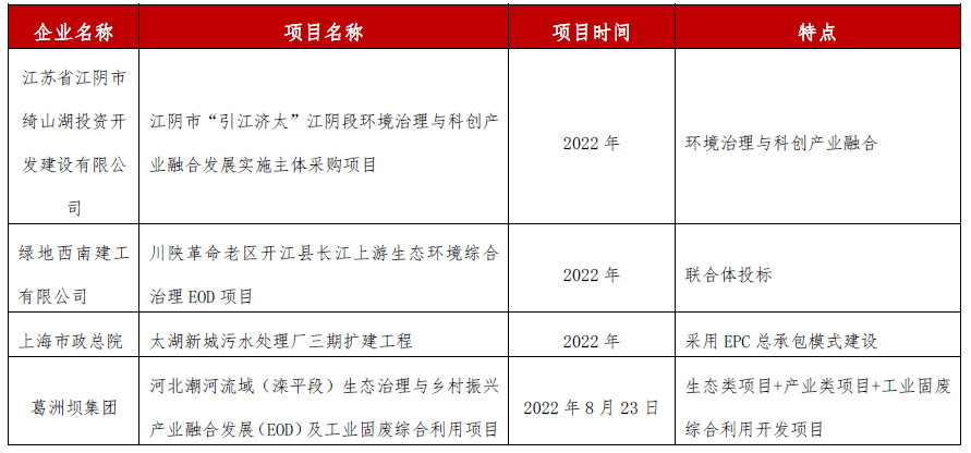 2021年12月江蘇省發(fā)布《推進污水資源化利用的實施方案》,鼓勵采用EOD開發(fā)模式,建設一批“新概念”污水處理廠、尾水生態(tài)凈化濕地等工程,形成可復制可推廣的利用模式。2019年江蘇省成立戰(zhàn)略性環(huán)保企業(yè)—江蘇省環(huán)保集團,其在2021年12月江蘇省第十四次黨代會提出明確提出:“探索環(huán)境修復+開發(fā)建設EOD新模式”,成為EOD項目實施主體,打通EOD項目落地的“最后一公里”。