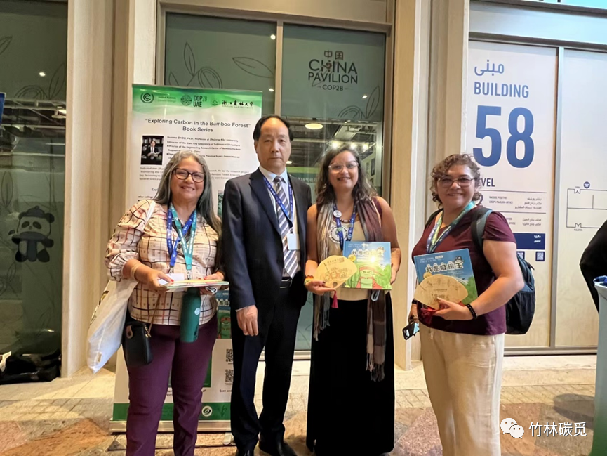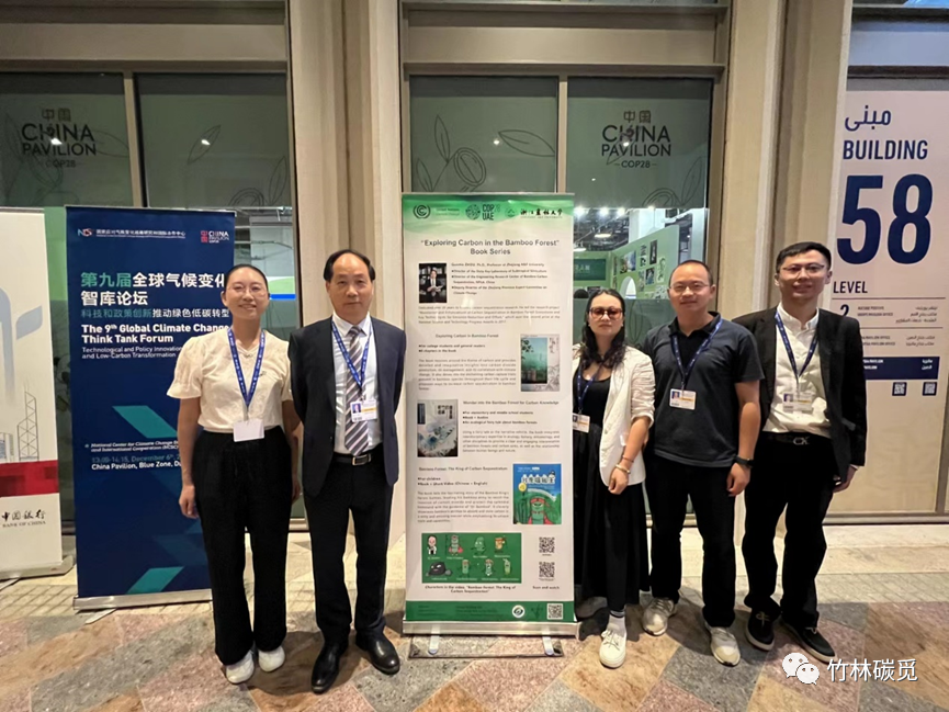 聯(lián)合國氣候變化框架公約第28次締約方大會于2023年11月30日在阿聯(lián)酋迪拜開幕。作為聯(lián)合國氣候變化大會觀察員單位,浙江農(nóng)林大學(xué)的周國模教授帶領(lǐng)團(tuán)隊(duì)成員徐林、李翀、梅婷婷和王麗一行5人赴迪拜參加了COP28。12月6日,團(tuán)隊(duì)《竹林碳覓》系列科普作品亮相中國角,吸引來自世界各地的參會者駐足關(guān)注,其中《我是吸碳王》兒童繪本(中英版)受熱捧,共贈送了150余本。此外,《我是吸碳王》短視頻在中國角冷餐會上循環(huán)播放。12月8日,由中國綠色碳匯基金會、加拿大UBC大學(xué)和浙江農(nóng)林大學(xué)聯(lián)合組織的“林業(yè)基于自然的氣候變化解決方案(NbS):知識與技能的全球?qū)υ?/span>”在COP28邊會上舉辦,來自國內(nèi)外的林業(yè)專家、企業(yè)家、政府官員等共同探討了林業(yè)緩解氣候變化的現(xiàn)狀和趨勢。會上,周國模教授團(tuán)隊(duì)成員作了題為“King of Carbon Sequestration: From Professional to Public for Bamboo Forest Carbon”和“Grading for Products Using Bamboo as a Substitute for Plastic based on an Integrated Environmental Effect”的報(bào)告,介紹了團(tuán)隊(duì)在竹林碳匯科普和“以竹代塑”產(chǎn)品分級上的相關(guān)工作,引起了與會者的廣泛關(guān)注和熱烈討論。