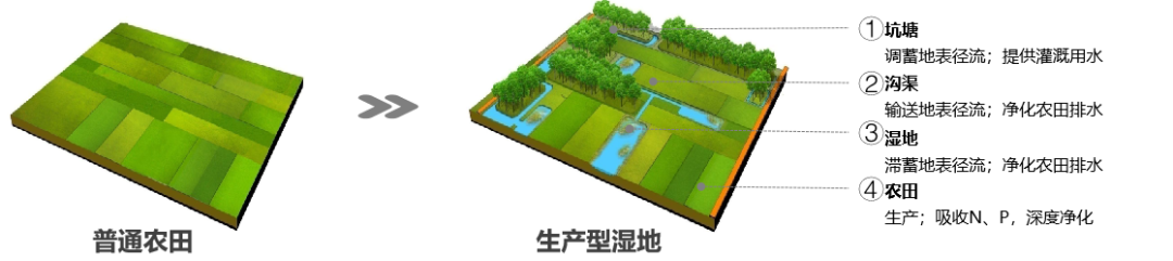 在農(nóng)田中引入坑塘、溝渠、濕地等生態(tài)單元,豐富農(nóng)田生境。結(jié)合當(dāng)?shù)剞r(nóng)作物及水生經(jīng)濟作物,引入“生產(chǎn)性濕地”,營造特色豐產(chǎn)田園,將生產(chǎn)與凈化相結(jié)合,變廢水為肥水,實現(xiàn)農(nóng)田面源污染的控制。