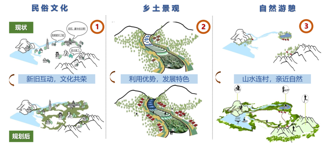 將環(huán)境改善與景觀營造進行功能借用與融合,而非簡單疊加,發(fā)揮民俗資源豐富的優(yōu)勢,“民俗文化+鄉(xiāng)村景觀+自然游憩”,山水連村,親近自然,實現(xiàn)美麗鄉(xiāng)村,推進生態(tài)休閑和民俗旅游的發(fā)展。