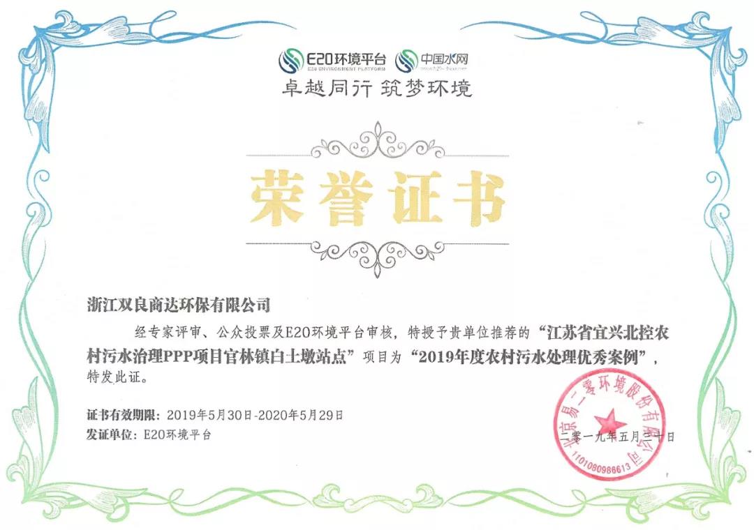 2019年5月,在2019(第五屆)環(huán)境施治論壇上,由雙良商達建設并運維的“江蘇省宜興北控農(nóng)村污水治理PPP項目官林鎮(zhèn)白土墩站點”被評為“2019年度農(nóng)村污水處理優(yōu)秀案例”。