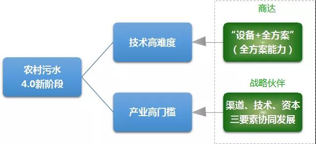 但是,農(nóng)村污水屬于政府類項目,是個高門檻的行業(yè),除了技術(shù)要素以外,渠道、資本也是關(guān)鍵要素。渠道是拿到項目的關(guān)鍵,而投融資能力則是保障項目順利實施的重要基礎(chǔ)。因此,渠道、技術(shù)、資本成為農(nóng)村污水處理產(chǎn)業(yè)新生態(tài)中的三要素。要想真正把項目做好,需要各方參與共生發(fā)展。