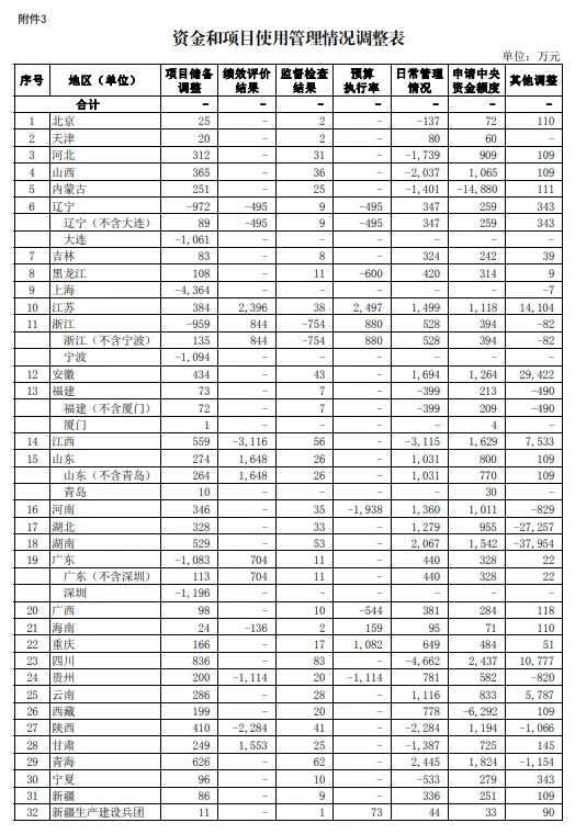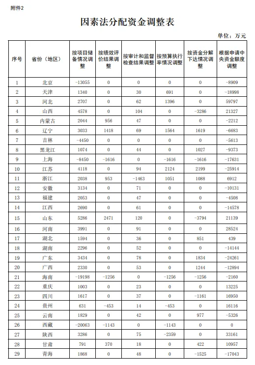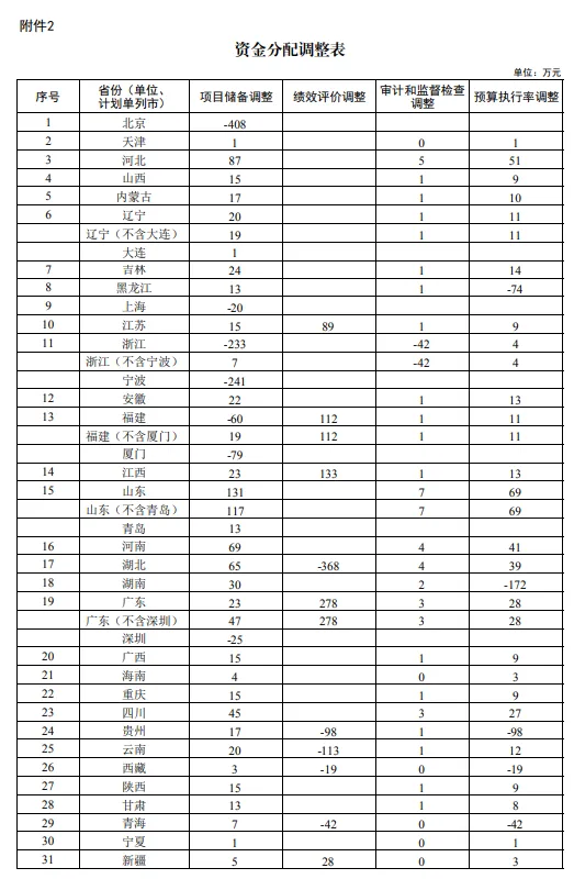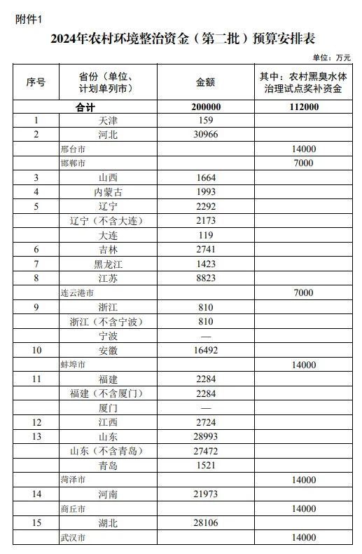 財政部關于下達2024年度大氣污染防治資金(第二批)預算的通知有關省、自治區(qū)、直轄市財政廳(局),新疆生產(chǎn)建設兵團財政局: 為支持大氣污染防治工作,促進大氣質(zhì)量改善,現(xiàn)下達你?。ㄗ灾螀^(qū)、直轄市、新疆生產(chǎn)建設兵團,以下簡稱?。?024年大氣污染防治資金,用于支持開展減污降碳等方面相關工作,并就有關事項通知如下: 一、各省安排金額見附件1,項目支出列2024年政府收支分類科目“211 節(jié)能環(huán)保支出”,項目代碼:10000014Z145060020001。 二、各省要按照《財政部關于修改<大氣污染防治資金管理辦法>的通知》(財資環(huán)〔2022〕106號)等規(guī)定,加強資金管理,專款專用,切實提高資金使用效益。按照“資金跟著項目走”的原則,做好項目儲備工作,盡快形成有效投資,避免“資金等項目”。對已從中央基建投資等其他渠道獲得中央財政資金支持的項目,不得納入防治資金支持范圍。 三、為進一步加強預算績效管理,請按照《中共中央 國務院關于全面實施預算績效管理的意見》的要求,對照下達的績效目標組織開展績效運行監(jiān)控,做好績效評價。同時,將你省績效目標及時對下分解,分解下達績效目標要同時抄送財政部有關監(jiān)管局。中央財政分配資金時,根據(jù)各地項目儲備情況、績效評價結(jié)果、審計和監(jiān)督檢查結(jié)果、預算執(zhí)行率和資金分解下達情況對轉(zhuǎn)移支付作了適當扣減,請你省在分配資金時,比照中央財政的做法,加強績效評價結(jié)果應用,突出獎優(yōu)罰劣,切實提高財政資金效益。 財政部關于下達2024年農(nóng)村環(huán)境整治資金(第二批)預算的通知各省、自治區(qū)、直轄市、計劃單列市財政廳(局),新疆生產(chǎn)建設兵團財政局: 為促進農(nóng)村生態(tài)環(huán)境質(zhì)量改善,加快推進農(nóng)村環(huán)境整治工作,現(xiàn)下達你省(自治區(qū)、直轄市及新疆生產(chǎn)建設兵團,以下統(tǒng)稱省)2024年農(nóng)村環(huán)境整治資金(第二批),并就有關事項通知如下: 一、各省安排金額見附件1,項目代碼:10000017Z175060020003,支出列2024年政府收支分類科目“211節(jié)能環(huán)保支出”。 二、資金分配突出獎優(yōu)罰劣原則。對績效評價結(jié)果排名靠后的相關省扣減資金,相應獎勵結(jié)果排名靠前的省;對資金執(zhí)行率靠后以及監(jiān)督檢查存在問題的相關省扣減資金,獎勵給其他省,詳見附件2。 三、請按照《財政部關于印發(fā)<農(nóng)村環(huán)境整治資金管理辦法>的通知》(財資環(huán)〔2021〕43號)等有關要求,將資金預算盡快落實到具體項目,切實提高資金使用效益。對已從中央基建投資等其他渠道獲得中央財政資金支持的項目,不得納入資金支持范圍。 四、本次下達資金包含2024年農(nóng)村黑臭水體治理試點資金額度的70%。請進一步加強項目管理,抓緊推動農(nóng)村黑臭水體治理工作,強化試點全過程監(jiān)管和實施情況調(diào)度,切實提高項目進度和預算執(zhí)行率。項目實施過程中重大問題及時上報。