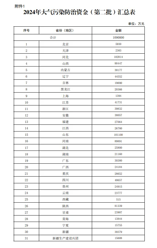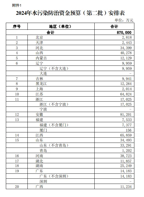 最近,2024年水污染防治、大氣污染防治、農(nóng)村環(huán)境整治等資金預算也陸續(xù)下達,這三筆預算分別為87億、109億和20億,具體如下: