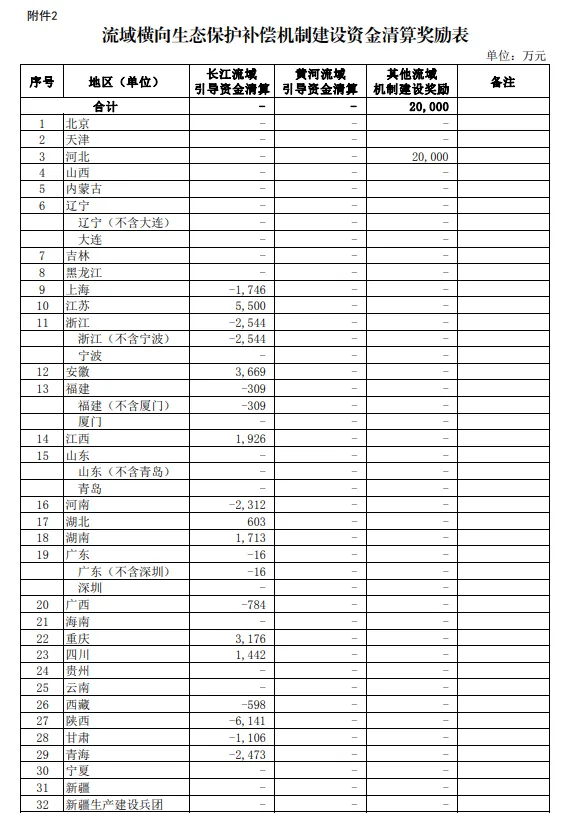 財政部關于下達2024年水污染防治資金預算(第二批)的通知各省、自治區(qū)、直轄市、計劃單列市財政廳(局),新疆生產(chǎn)建設兵團財政局: 為促進水環(huán)境質(zhì)量改善,加快推進水污染防治工作,現(xiàn)下達你省(自治區(qū)、直轄市、新疆生產(chǎn)建設兵團、計劃單列市,以下統(tǒng)稱省)2024年水污染防治資金(第二批),用于支持水污染防治和水生態(tài)環(huán)境保護等方面工作,并就有關事項通知如下: 一、各省安排金額見附件1,項目代碼:10000015Z155110010004,支出列2024年政府收支分類科目“211節(jié)能環(huán)保支出”。 二、各省要按照《財政部關于印發(fā)<水污染防治資金管理辦法>的通知》(財資環(huán)〔2021〕36號)有關規(guī)定,加強資金管理,專款專用,切實提高資金使用效益。落實生態(tài)環(huán)保項目儲備制度有關要求,按照“資金跟著項目走”的原則,做好項目儲備工作,盡快形成有效投資,避免“資金等項目”。對已從中央基建投資等其他渠道獲得中央財政資金支持的項目,不得納入防治資金支持范圍。 三、此次下達資金對建立起橫向生態(tài)保護補償機制且完成年度清算的四川省、重慶市、湖北省、湖南省、江西省、安徽省、江蘇省分別給予獎勵,獎勵資金從其他未建立起機制的省份中扣減。同時,對河北省、北京市簽訂潮白河流域補償協(xié)議,積極推動流域橫向生態(tài)保護補償機制建設給予肯定和鼓勵,后續(xù)將視省級資金清算情況進行獎勵支持。各省要按照相關文件要求,積極主動開展合作,加快與鄰近省建立機制,已獲得獎勵資金的省份要推動建立長效機制。 四、各地要強化績效結(jié)果應用,中央財政在分配資金時,對審計和監(jiān)督檢查發(fā)現(xiàn)問題、績效評價結(jié)果差、預算支出進展慢的省份作了適當扣減,請你省在分配資金時,比照中央財政的做法,加強績效評價結(jié)果應用,突出獎優(yōu)罰劣,切實提高財政資金效益。 2.流域橫向生態(tài)保護補償機制建設資金清算獎勵表